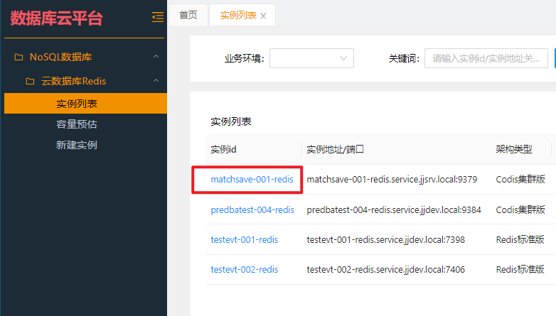 可查询到与 “redis_jgbc” 对应的实例为 “matchsave-001-redis.service.jjsrv.local:9379” ,