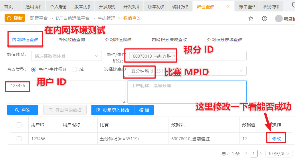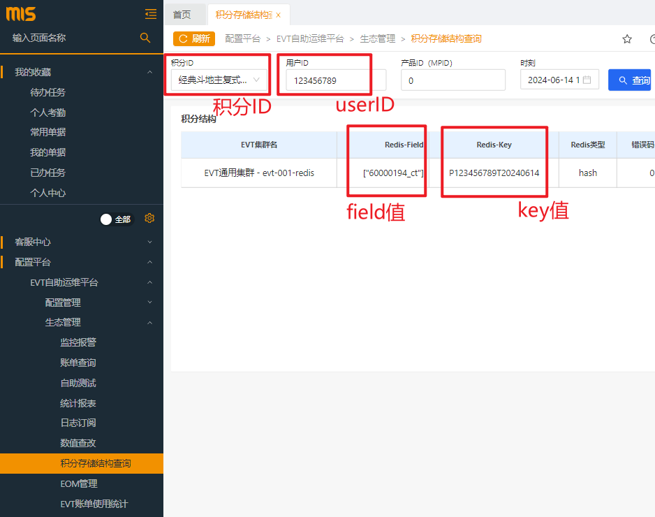 如上图所示,即可知道该积分 id 对应的 field 值 与 key 值,userID 是为了查询随便输入的。